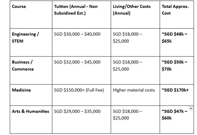 - Variation: Arts and Business courses are at the lower end; Medicine and Dentistry are significantly higher, drastically increasing the Cost of Study in Singapore.