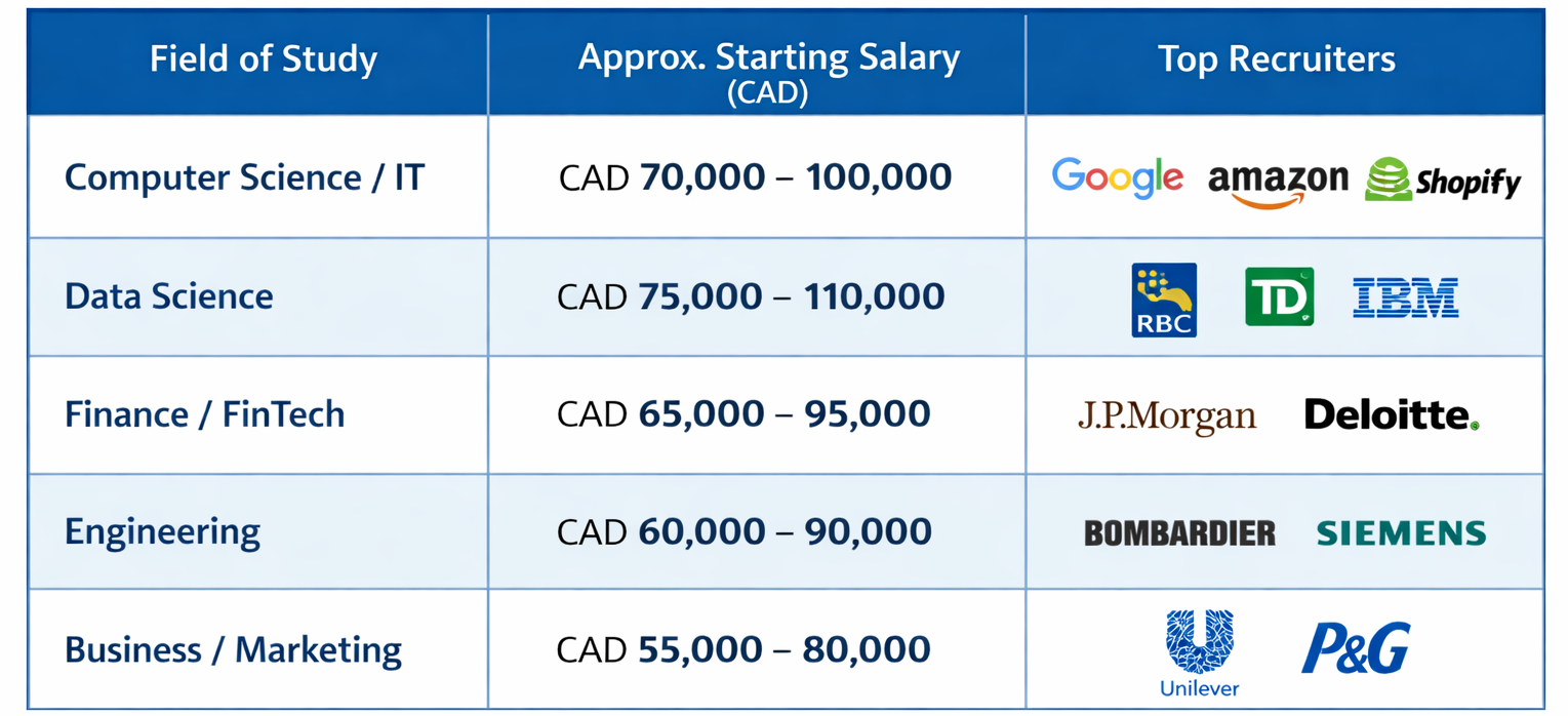 2. What salary can I expect after MS in Canada? Most graduates earn between CAD 5,000–8,500 per month depending on the field.