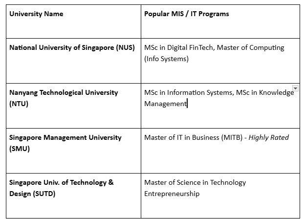 Here are the top-ranked universities offering MIS in Singapore (or equivalent Masters in Information Systems/IT in Business):