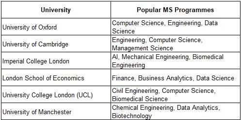 Here are some of the top-ranked UK universities for MS programmes: